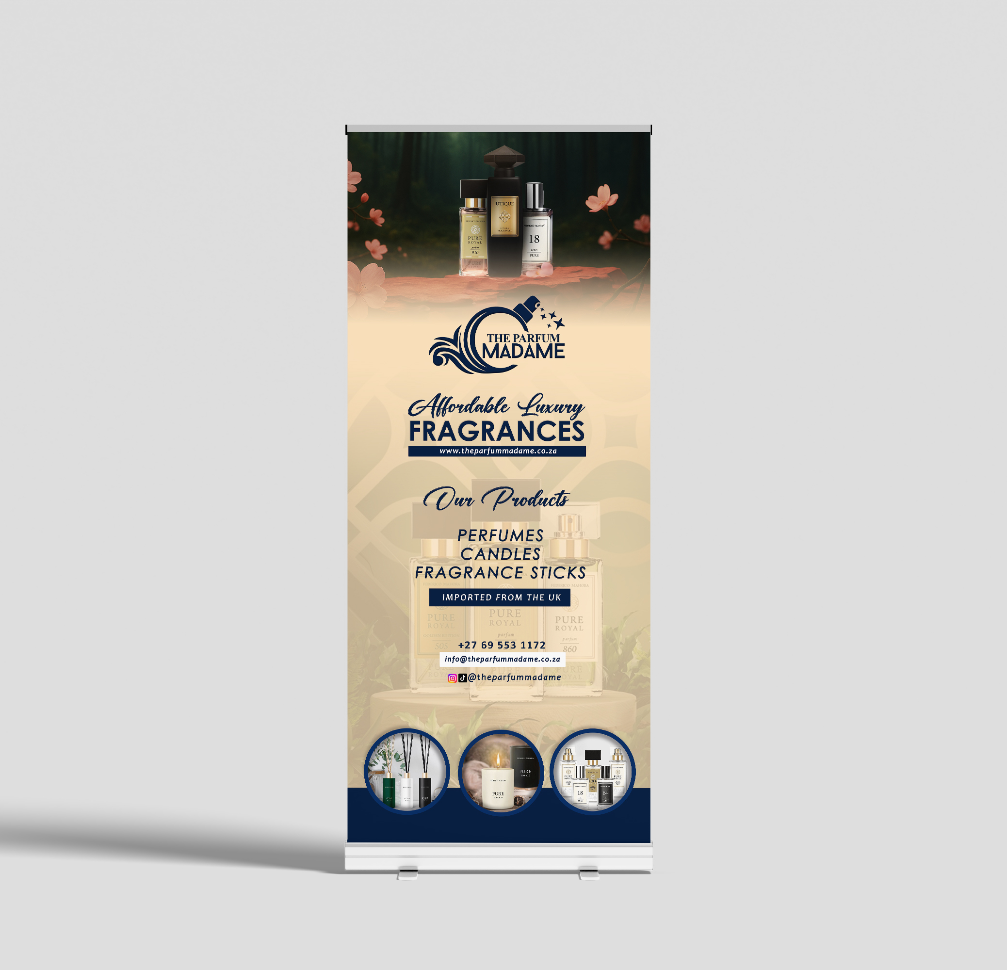 A modern pull-up banner design crafted to align with the brand’s premium fragrance identity, combining visual elegance with clear, impactful messaging.
